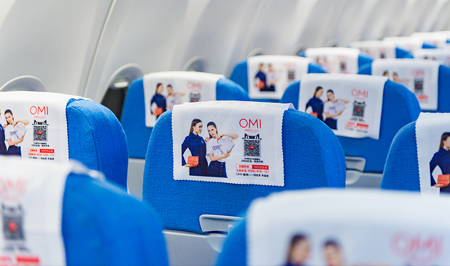 一進入機艙,每個座椅上醒目統(tǒng)一的頭片廣告,全艙集中呈現(xiàn),營造出一種沖擊力極強的視覺